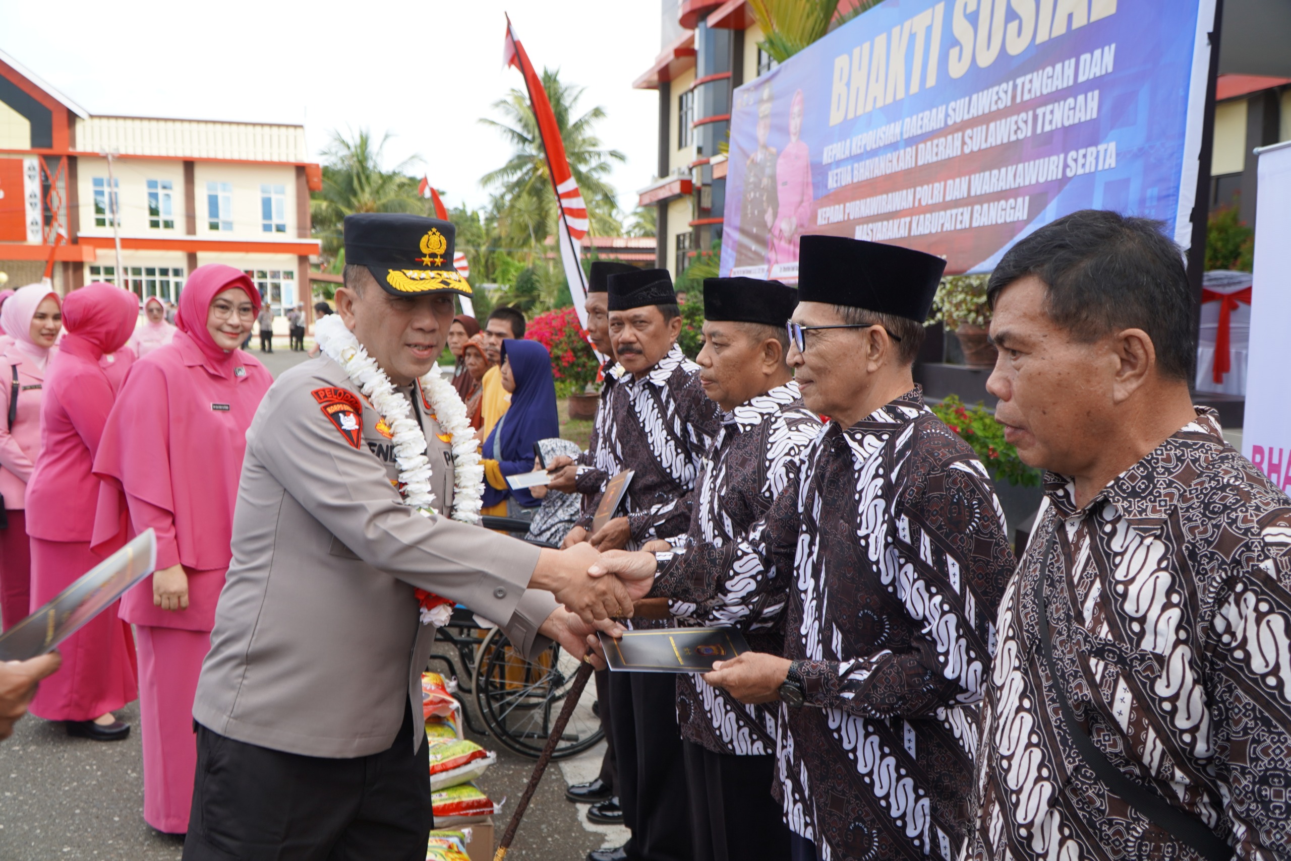 Luwuk - Kepala Kepolisian Daerah Sulawesi Tengah, Irjen Pol. Dr. Endi Sutendi, S.I.K., S.H., M.H bersama Ketua Bhayangkari Daerah Sulteng Ny. Maulida Endi Sutendi berkesempatan memberikan tali asih berupa bantuan sosial, kepada purnawirawan, warakawuri dan masyarakat.
